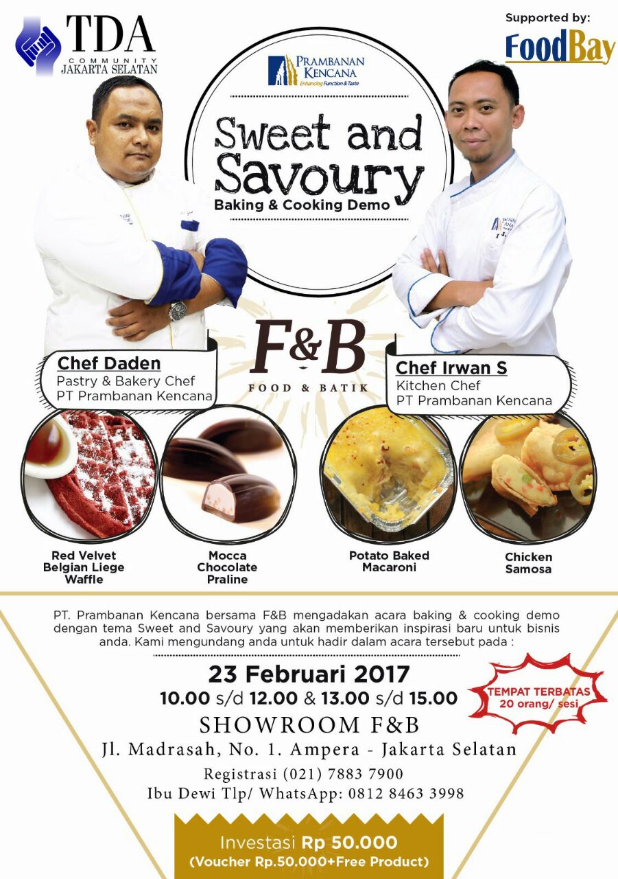 TDA JAKSEL bekerjasama dengan PT Prambanan Kencana bersama F&B mengadakan acara baking & cooking demo dengan tema Sweet and Savoury, yang akan memberikan inspirasi baru untuk bisnis Anda.