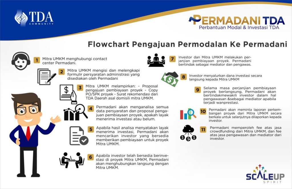 Anggota TDA yang memerlukan permodalan/pembiayaan usaha dan ingin mengakses via Permadani, dapat menghubungi kontak Permadani untuk selanjutnya dibantu dari mulai persyaratan administrasi, pengajuan kepada investor, pencairan dana dan pengawasan selama perjanjian pembiayaan/investasi berlangsung.
