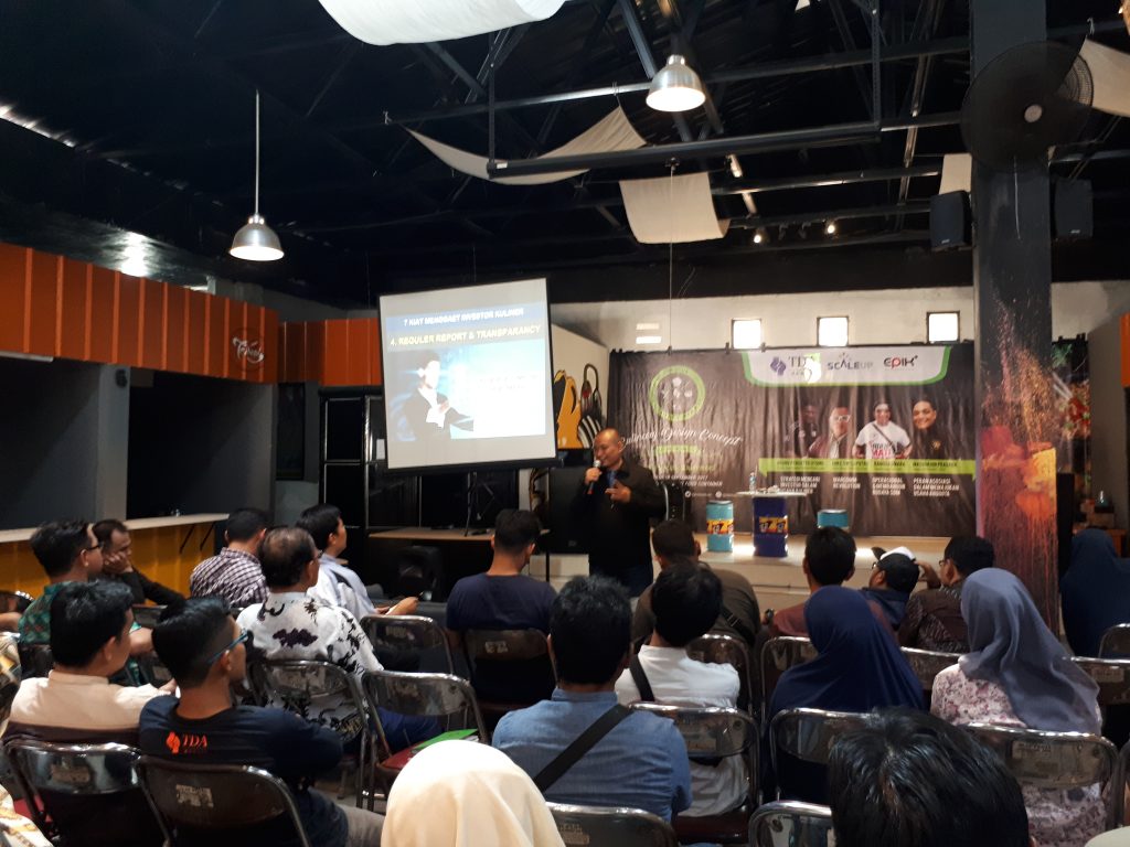 Sesi pertama sharing disampaikan oleh Agung Prasetyo Utomo (APU) tentang “Strategi Mencari Investor dalam Usaha Kuliner” karena kemampuan untuk berhitung dan mempresentasikan bisnis kepada investor acapkali menjadi tantangan tersendiri bagi pelaku bisnis. APU dikenal sebagai orang yang luwes dan menjalankan beberapa kuadran baik business owner dan investor. 108 outlet Indomaret dan Alfamart serta Warung Pepes33 karawang adalah bisnis dimana beliau adalah investor, sedangkan “Warung Kepo” Tanjung Priok, dan 9 outlet Ayam Geprek Juara adalah bisnis dimana beliau sebagai business owner.