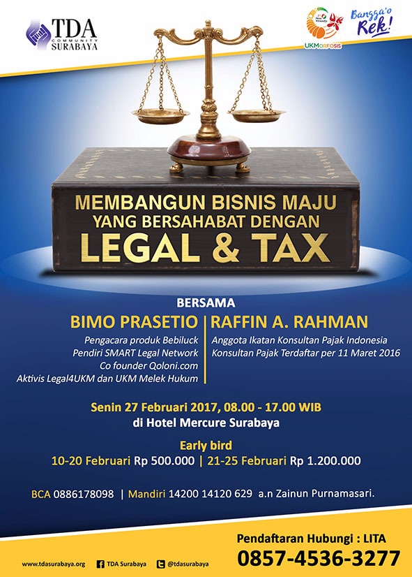 Sahabat TDA, jangan biarkan bisnis yang kita rintis bertahun-tahun berakhir sia-sia. Paham Legal dan Tax itu sangat penting. Dan hanya orang2 yang peduli Legal dan Tax yang terbukti bisnisnya maju pesat dan semakin besar.